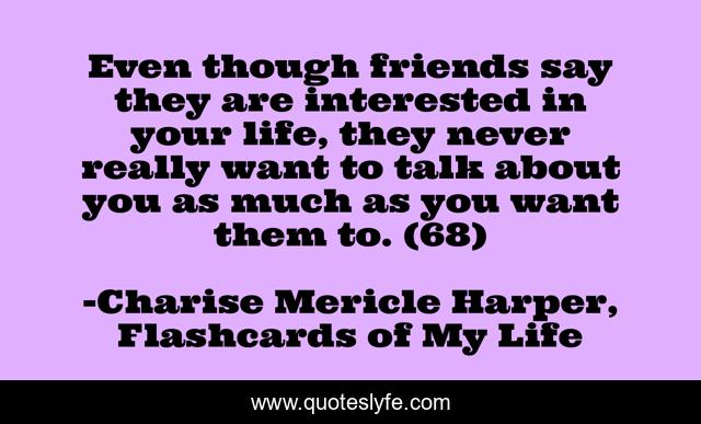 This page presents the quote "Even though friends say they are interested in your life, they never really want to talk about you as much as you want them to. (68)". Author of this quote is Charise Mericle Harper, Flashcards of My Life. This quote is about narcissism, life, sharing, friendship, talking, friends,.
