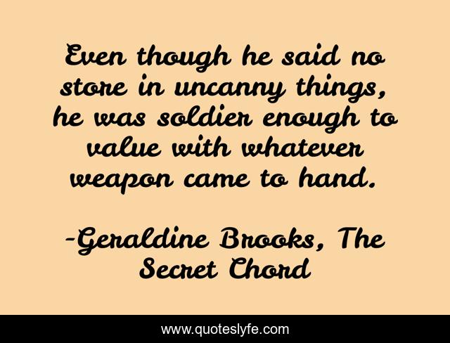 This page presents the quote "Even though he said no store in uncanny things, he was soldier enough to value with whatever weapon came to hand.". Author of this quote is Geraldine Brooks, The Secret Chord. This quote is about manipulation, pragmatism, persuasion, leadership, imagery,.