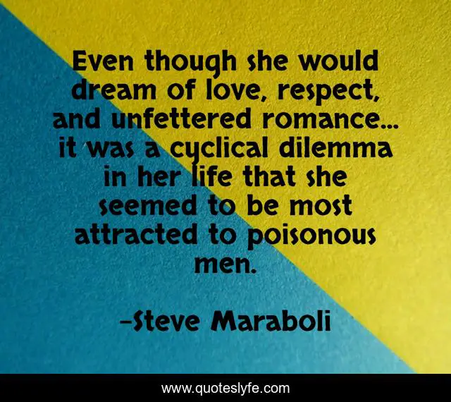 This page presents the quote "Even though she would dream of love, respect, and unfettered romance... it was a cyclical dilemma in her life that she seemed to be most attracted to poisonous men.". Author of this quote is Steve Maraboli. This quote is about relationships, society, men, women,.