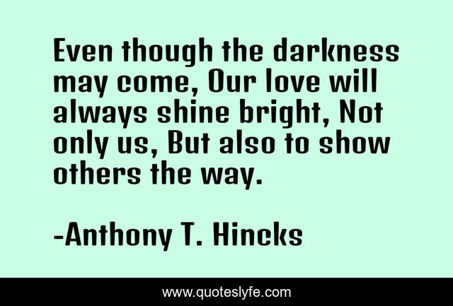 This page presents the quote "Even though the darkness may come, Our love will always shine bright, Not only us, But also to show others the way.". Author of this quote is Anthony T. Hincks. This quote is about shine, love, darkness, show, ways, light, philosophy, bright, the-way,.