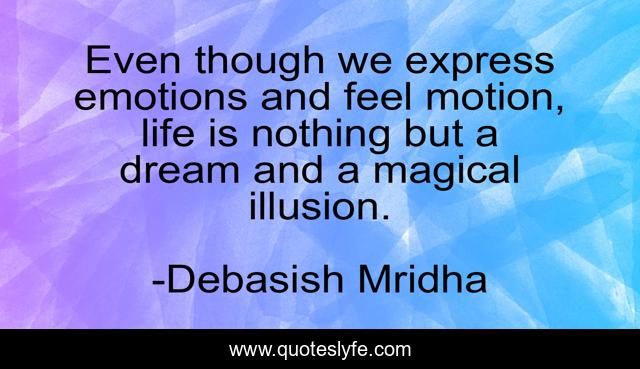 This page presents the quote "Even though we express emotions and feel motion, life is nothing but a dream and a magical illusion.". Author of this quote is Debasish Mridha. This quote is about life-is-nothing-but-a-dream, philosophy, debasish-mridha, emotions, quotes, express-emotions, inspirational, enthusiasm, dream,.