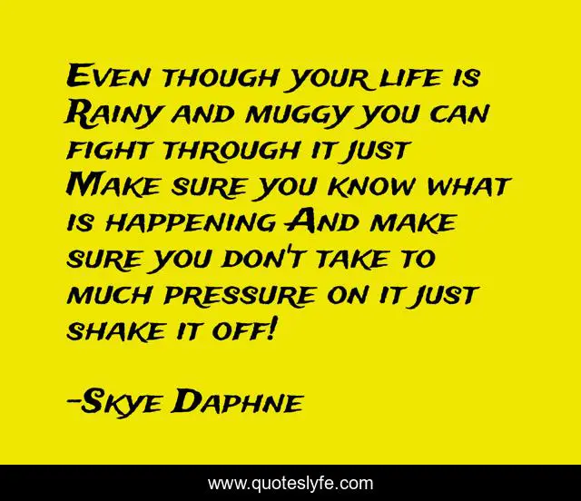 This page presents the quote "Even though your life is Rainy and muggy you can fight through it just Make sure you know what is happening And make sure you don't take to much pressure on it just shake it off!". Author of this quote is Skye Daphne. This quote is about enthusiasm, inspirational,.