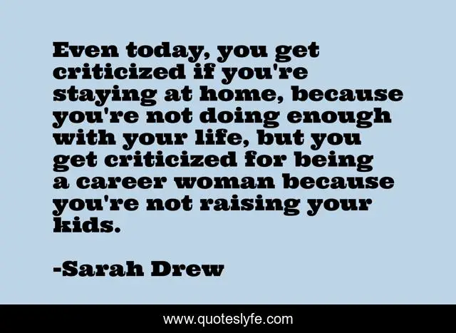 This page presents the quote "Even today, you get criticized if you're staying at home, because you're not doing enough with your life, but you get criticized for being a career woman because you're not raising your kids.". Author of this quote is Sarah Drew. This quote is about life, woman, today,.
