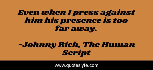 This page presents the quote "Even when I press against him his presence is too far away.". Author of this quote is Johnny Rich, The Human Script. This quote is about lovers, love, presence, intimate, closeness, tenderness, touch, close, tender,.
