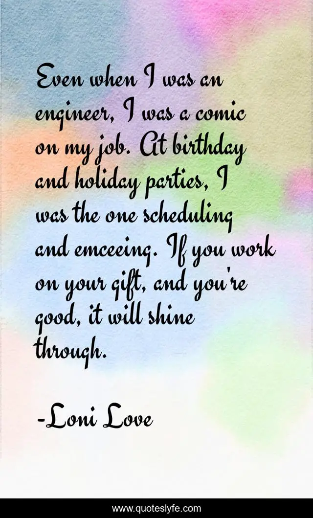 This page presents the quote "Even when I was an engineer, I was a comic on my job. At birthday and holiday parties, I was the one scheduling and emceeing. If you work on your gift, and you're good, it will shine through.". Author of this quote is Loni Love. This quote is about work, job, good,.