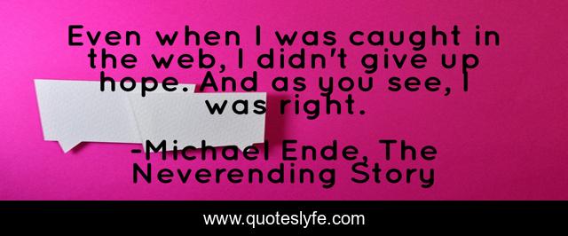 This page presents the quote "Even when I was caught in the web, I didn't give up hope. And as you see, I was right.". Author of this quote is Michael Ende, The Neverending Story. This quote is about hope, optimism,.
