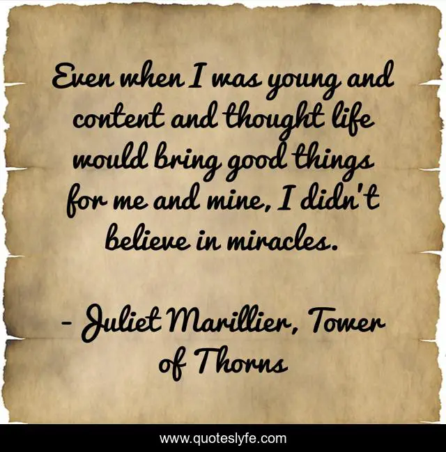 This page presents the quote "Even when I was young and content and thought life would bring good things for me and mine, I didn't believe in miracles.". Author of this quote is Juliet Marillier, Tower of Thorns. .