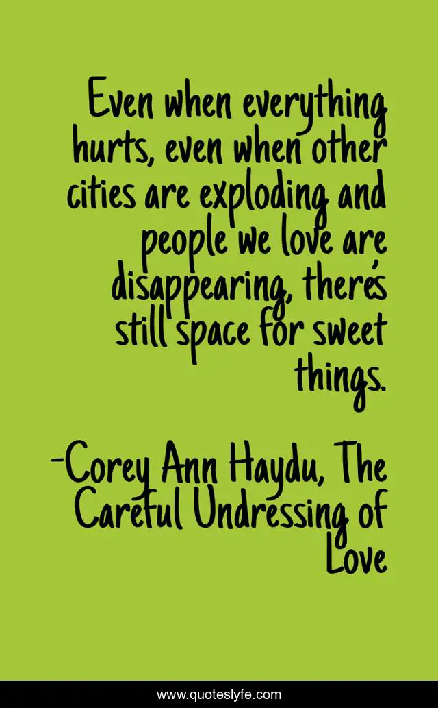 This page presents the quote "Even when everything hurts, even when other cities are exploding and people we love are disappearing, there’s still space for sweet things.". Author of this quote is Corey Ann Haydu, The Careful Undressing of Love. This quote is about love, recovery, hopeful, loss-and-pain, hope, affection,.