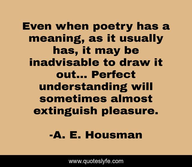 This page presents the quote "Even when poetry has a meaning, as it usually has, it may be inadvisable to draw it out... Perfect understanding will sometimes almost extinguish pleasure.". Author of this quote is A. E. Housman. This quote is about meaning, understanding,.