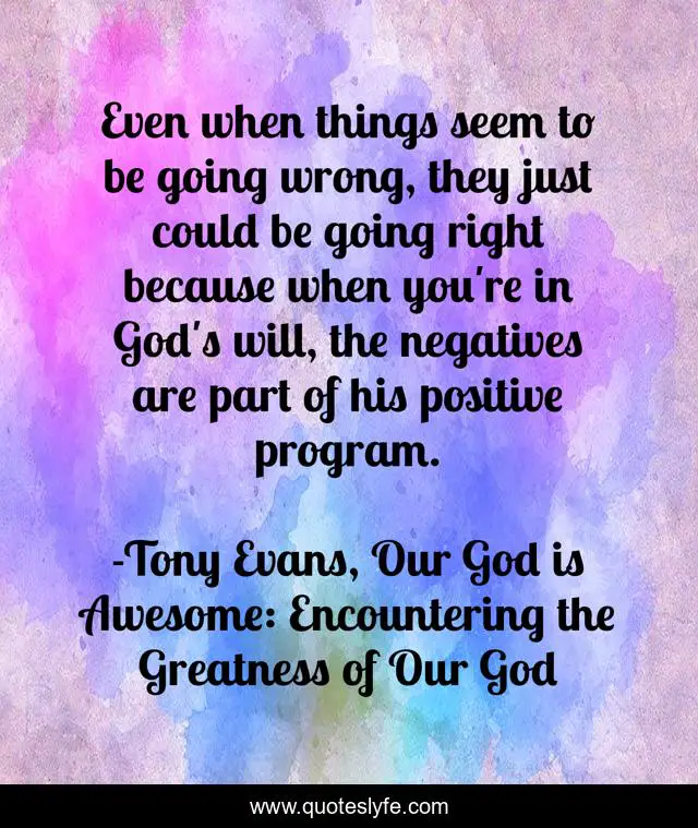 This page presents the quote "Even when things seem to be going wrong, they just could be going right because when you're in God's will, the negatives are part of his positive program.". Author of this quote is Tony Evans, Our God is Awesome: Encountering the Greatness of Our God. This quote is about god-s-will, adversity,.