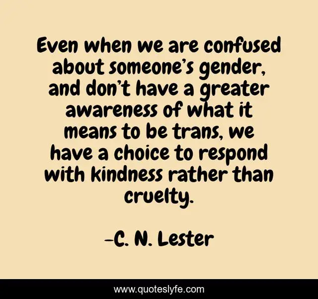 This page presents the quote "Even when we are confused about someone’s gender, and don’t have a greater awareness of what it means to be trans, we have a choice to respond with kindness rather than cruelty.". Author of this quote is C. N. Lester. This quote is about gender, transgender, lgbtq, genderqueer, sociology,.