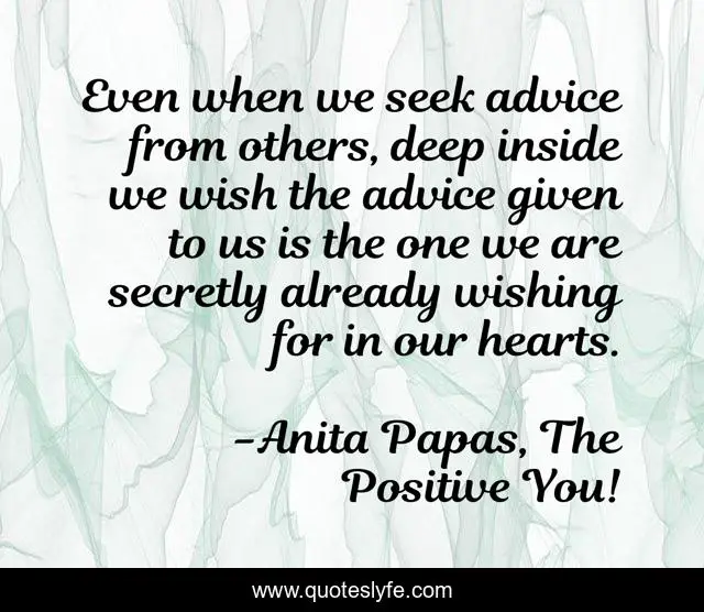 This page presents the quote "Even when we seek advice from others, deep inside we wish the advice given to us is the one we are secretly already wishing for in our hearts.". Author of this quote is Anita Papas, The Positive You!. This quote is about confidence, positive, positivity, motivational, positive-thinking, positive-attitude, optimistic, self-help, positive-thoughts,.