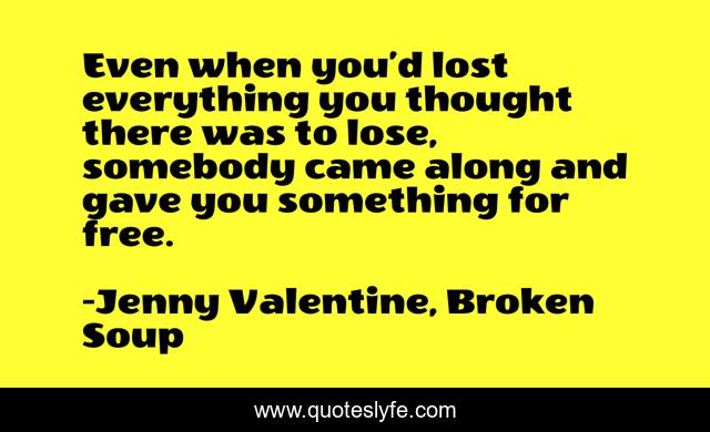 This page presents the quote "Even when you’d lost everything you thought there was to lose, somebody came along and gave you something for free.". Author of this quote is Jenny Valentine, Broken Soup. This quote is about free, everything, gift, present, lost,.