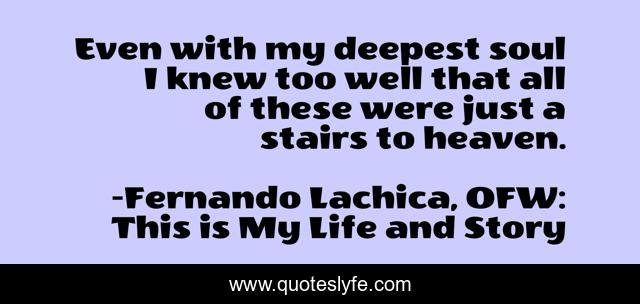 This page presents the quote "Even with my deepest soul I knew too well that all of these were just a stairs to heaven.". Author of this quote is Fernando Lachica, OFW: This is My Life and Story. This quote is about love, family, money, work-abroad, ofw, employment, children, affection,.