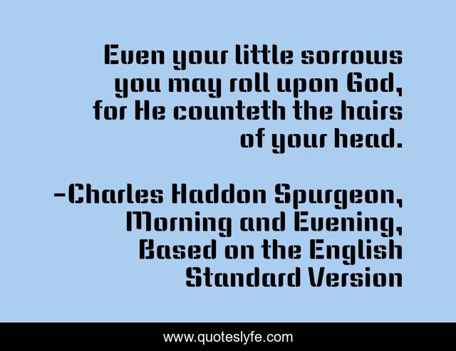 This page presents the quote "Even your little sorrows you may roll upon God, for He counteth the hairs of your head.". Author of this quote is Charles Haddon Spurgeon, Morning and Evening, Based on the English Standard Version. This quote is about anxiety, depression, prayer,.