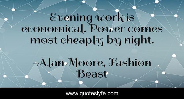 This page presents the quote "Evening work is economical. Power comes most cheaply by night.". Author of this quote is Alan Moore, Fashion Beast. This quote is about economics, fashion, power,.