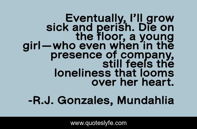 This page presents the quote "Eventually, I’ll grow sick and perish. Die on the floor, a young girl—who even when in the presence of company, still feels the loneliness that looms over her heart.". Author of this quote is R.J. Gonzales, Mundahlia. This quote is about loneliness, heartbreak, sad,.