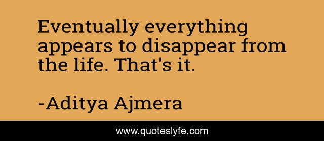 This page presents the quote "Eventually everything appears to disappear from the life. That's it.". Author of this quote is Aditya Ajmera. This quote is about appearance, impermanence, awareness, life-philosophy, illusion, disappear,.