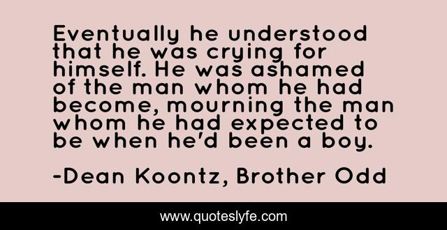 This page presents the quote "Eventually he understood that he was crying for himself. He was ashamed of the man whom he had become, mourning the man whom he had expected to be when he'd been a boy.". Author of this quote is Dean Koontz, Brother Odd. This quote is about life, adulthood, dreams, hopes, brother-knuckles, childhood, odd-thomas,.