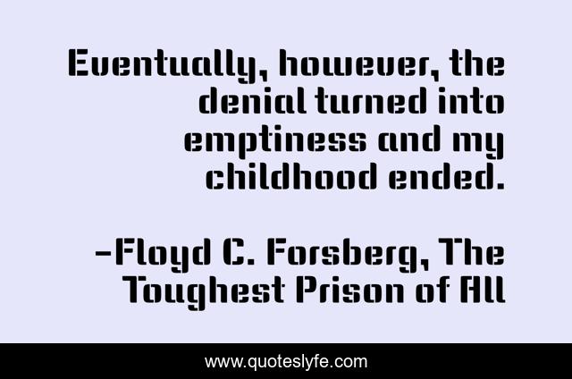 This page presents the quote "Eventually, however, the denial turned into emptiness and my childhood ended.". Author of this quote is Floyd C. Forsberg, The Toughest Prison of All. This quote is about denial, end, disbelief, numbness, childhood-traumas, growing-up-too-fast, forced-to-grow-up, ended, death,.