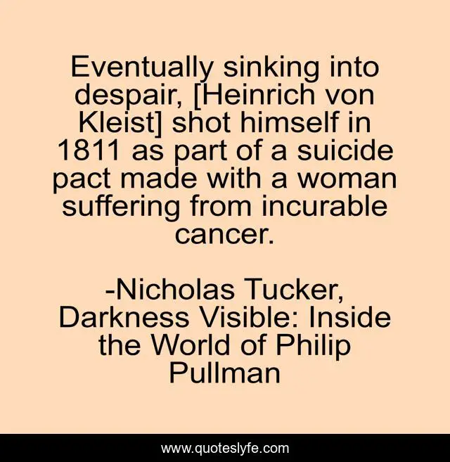 This page presents the quote "Eventually sinking into despair, [Heinrich von Kleist] shot himself in 1811 as part of a suicide pact made with a woman suffering from incurable cancer.". Author of this quote is Nicholas Tucker, Darkness Visible: Inside the World of Philip Pullman. .