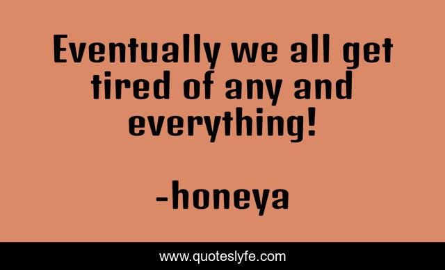 This page presents the quote "Eventually we all get tired of any and everything!". Author of this quote is honeya. This quote is about relationships, money, philosophy, love, affection,.