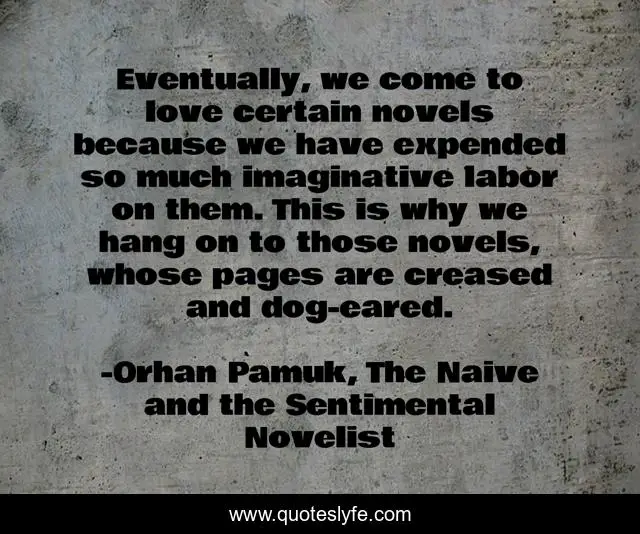 This page presents the quote "Eventually, we come to love certain novels because we have expended so much imaginative labor on them. This is why we hang on to those novels, whose pages are creased and dog-eared.". Author of this quote is Orhan Pamuk, The Naive and the Sentimental Novelist. .