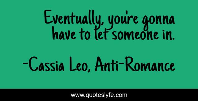 This page presents the quote "Eventually, you're gonna have to let someone in.". Author of this quote is Cassia Leo, Anti-Romance. This quote is about new-adult, humor, anti-romance, fiction, romance, cassia-leo, comedy,.
