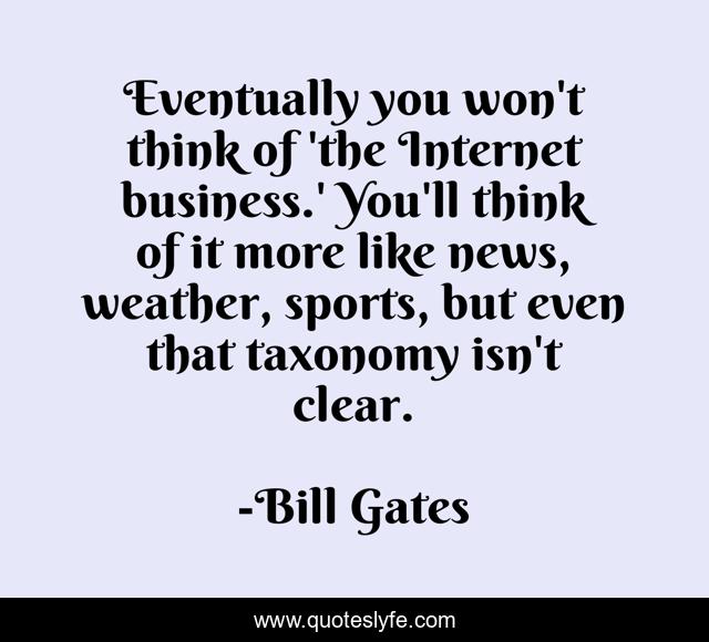 This page presents the quote "Eventually you won't think of 'the Internet business.' You'll think of it more like news, weather, sports, but even that taxonomy isn't clear.". Author of this quote is Bill Gates. This quote is about weather, business, internet,.