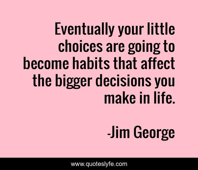 This page presents the quote "Eventually your little choices are going to become habits that affect the bigger decisions you make in life.". Author of this quote is Jim George. This quote is about faith, faithful, god, big, men, blessed, choices, habits, prayer,.