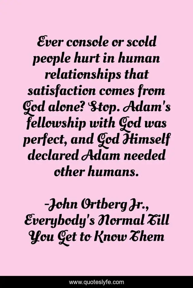 This page presents the quote "Ever console or scold people hurt in human relationships that satisfaction comes from God alone? Stop. Adam's fellowship with God was perfect, and God Himself declared Adam needed other humans.". Author of this quote is John Ortberg Jr., Everybody's Normal Till You Get to Know Them. This quote is about fellowship, community,.