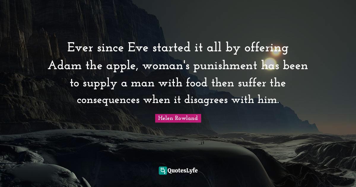 This page presents the quote "Ever since Eve started it all by offering Adam the apple, woman's punishment has been to supply a man with food then suffer the consequences when it disagrees with him.". Author of this quote is Helen Rowland. This quote is about woman, apple, man,.