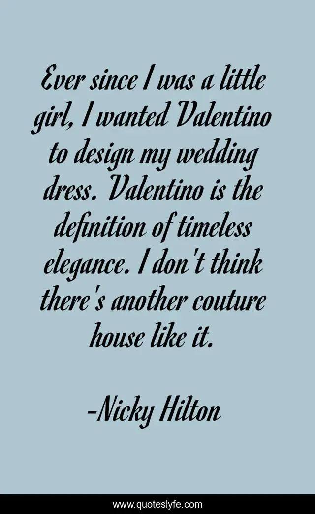 This page presents the quote "Ever since I was a little girl, I wanted Valentino to design my wedding dress. Valentino is the definition of timeless elegance. I don't think there's another couture house like it.". Author of this quote is Nicky Hilton. This quote is about design, girl, dress,.