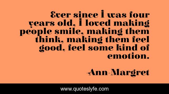 This page presents the quote "Ever since I was four years old, I loved making people smile, making them think, making them feel good, feel some kind of emotion.". Author of this quote is Ann-Margret. This quote is about feel good, good, people,.