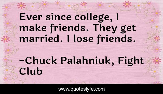 This page presents the quote "Ever since college, I make friends. They get married. I lose friends.". Author of this quote is Chuck Palahniuk, Fight Club. This quote is about college, friends,.