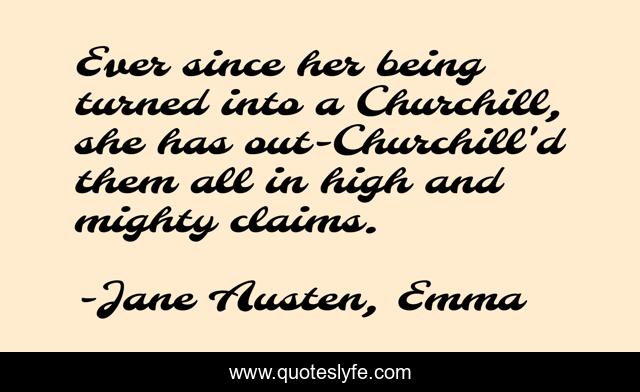 This page presents the quote "Ever since her being turned into a Churchill, she has out-Churchill'd them all in high and mighty claims.". Author of this quote is Jane Austen, Emma. This quote is about society, life, people, every-day-life,.