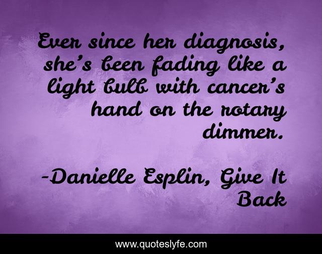 This page presents the quote "Ever since her diagnosis, she’s been fading like a light bulb with cancer’s hand on the rotary dimmer.". Author of this quote is Danielle Esplin, Give It Back. This quote is about dim, cancer, dying, light, sick, fading,.