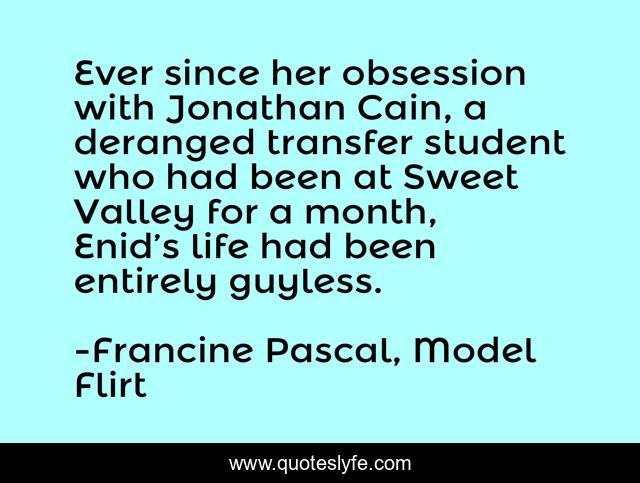 This page presents the quote "Ever since her obsession with Jonathan Cain, a deranged transfer student who had been at Sweet Valley for a month, Enid’s life had been entirely guyless.". Author of this quote is Francine Pascal, Model Flirt. This quote is about sweet-valley, single, obsession,.