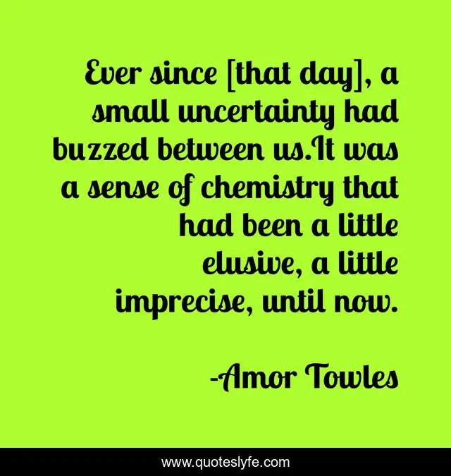 This page presents the quote "Ever since [that day], a small uncertainty had buzzed between us.It was a sense of chemistry that had been a little elusive, a little imprecise, until now.". Author of this quote is Amor Towles. This quote is about relationships, friendships, chemistry,.