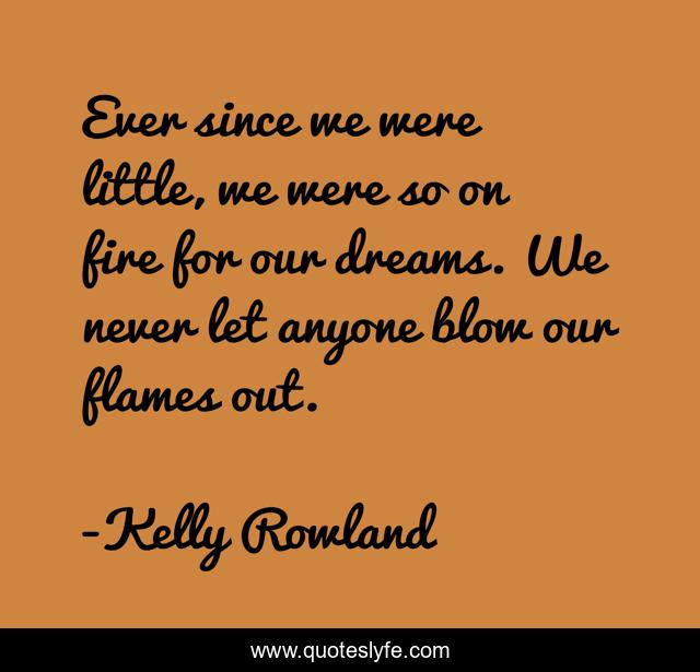 This page presents the quote "Ever since we were little, we were so on fire for our dreams. We never let anyone blow our flames out.". Author of this quote is Kelly Rowland. This quote is about fire, little,.