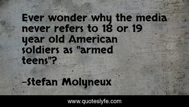 This page presents the quote "Ever wonder why the media never refers to 18 or 19 year old American soldiers as "armed teens"?". Author of this quote is Stefan Molyneux. This quote is about anarchy, government, freedom, philosophy, statism, liberty, voluntaryism, state, libertarian,.