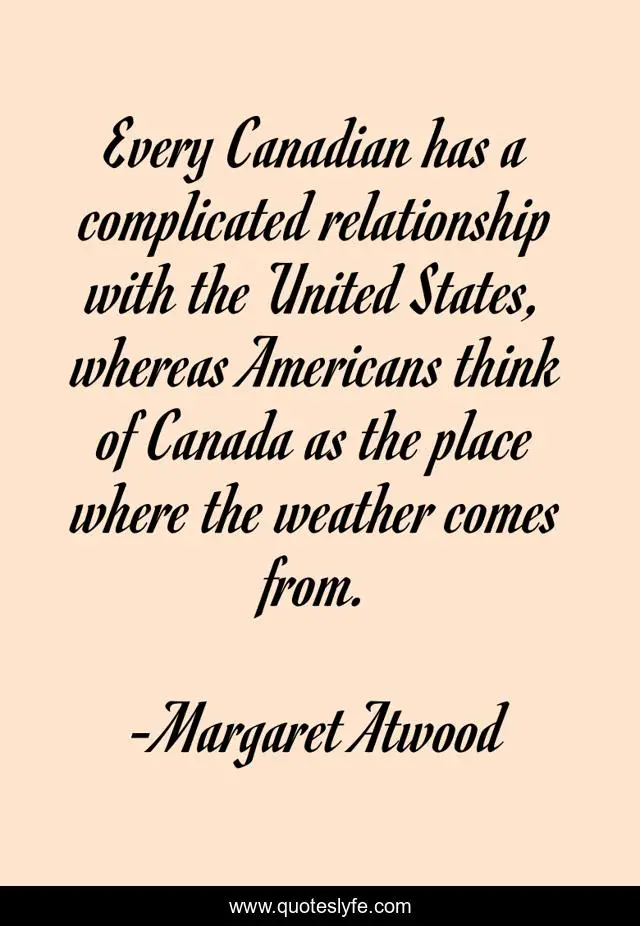 This page presents the quote "Every Canadian has a complicated relationship with the United States, whereas Americans think of Canada as the place where the weather comes from.". Author of this quote is Margaret Atwood. This quote is about canada, atwood, weather, complicated, united-states, america,.