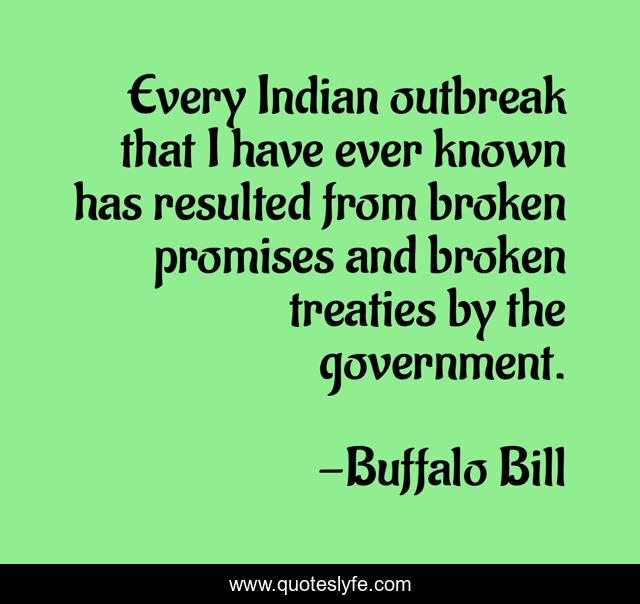 This page presents the quote "Every Indian outbreak that I have ever known has resulted from broken promises and broken treaties by the government.". Author of this quote is Buffalo Bill. This quote is about broken, promises,.