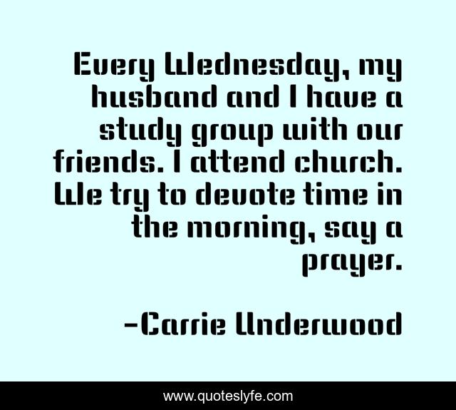 This page presents the quote "Every Wednesday, my husband and I have a study group with our friends. I attend church. We try to devote time in the morning, say a prayer.". Author of this quote is Carrie Underwood. This quote is about friends, wednesday, time,.