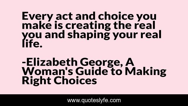 This page presents the quote "Every act and choice you make is creating the real you and shaping your real life.". Author of this quote is Elizabeth George, A Woman's Guide to Making Right Choices. This quote is about real, faith, life, right, christian, god, create, choice, shape,.