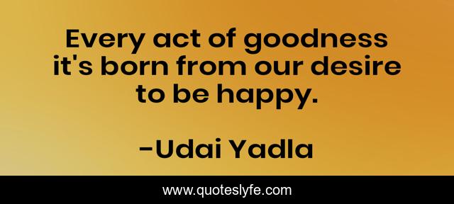 This page presents the quote "Every act of goodness it's born from our desire to be happy.". Author of this quote is Udai Yadla. This quote is about confidence, peace, love, inspirational, positive, motivational, optimistic, goodness, indian-fiction,.