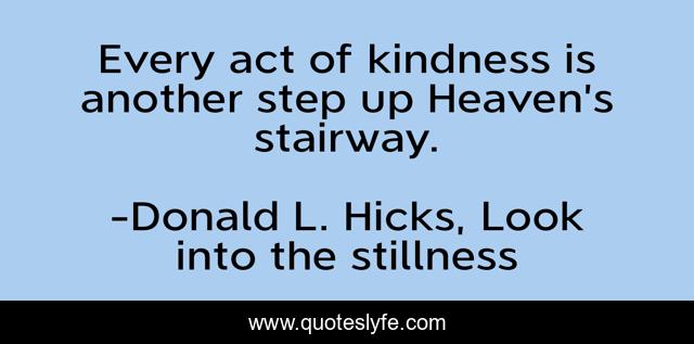 This page presents the quote "Every act of kindness is another step up Heaven’s stairway.". Author of this quote is Donald L. Hicks, Look into the stillness. This quote is about kindness, heavenly-rewards, heaven,.