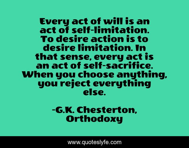 This page presents the quote "Every act of will is an act of self-limitation. To desire action is to desire limitation. In that sense, every act is an act of self-sacrifice. When you choose anything, you reject everything else.". Author of this quote is G.K. Chesterton, Orthodoxy. This quote is about action, desire, limitation, kantian,.