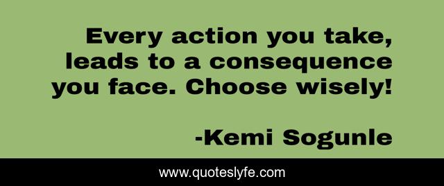This page presents the quote "Every action you take, leads to a consequence you face. Choose wisely!". Author of this quote is Kemi Sogunle. This quote is about living, life, outcomes, life-lessons, action, consequences-life-lessons,.