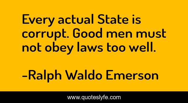 This page presents the quote "Every actual State is corrupt. Good men must not obey laws too well.". Author of this quote is Ralph Waldo Emerson. This quote is about good, laws, good men,.